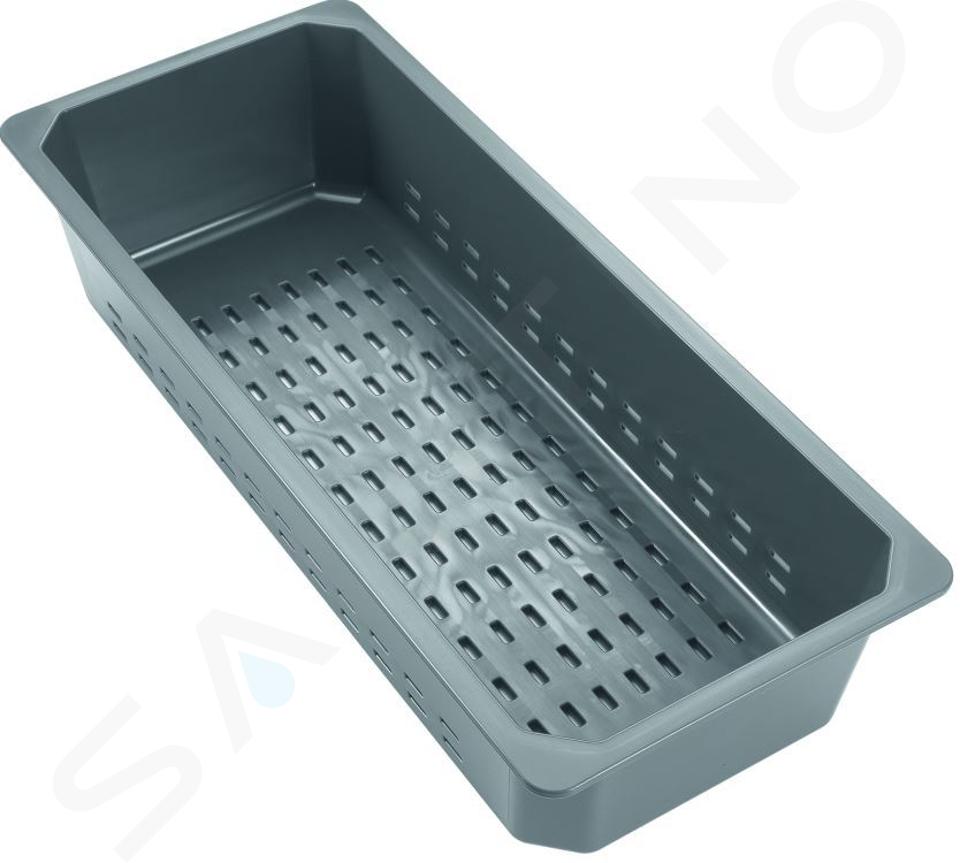 La superficie de la cubeta consta de pequeños orificios para el drenaje del agua. Además de la vajilla, también puede colocar aquí alimentos que necesiten escurrirse. El cuenco es de color gris y sus dimensiones son 181 x 440 x 92 mm.