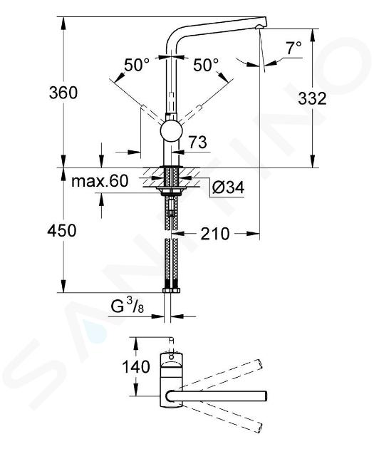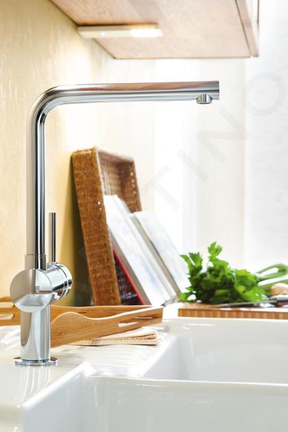 El grifo Grohe Minta está a tu disposición. Sólo el caño ya merece ser destacado. Tiene un rango de giro ajustable: 0°, 150° o 360°. El caño puede bloquearse en una de estas posiciones o dejarse girar libremente. Los que tienen un fregadero doble necesitan un rango mayor, mientras que los que tienen un fregadero pequeño apreciarán la opción de bloquear el grifo en una posición.