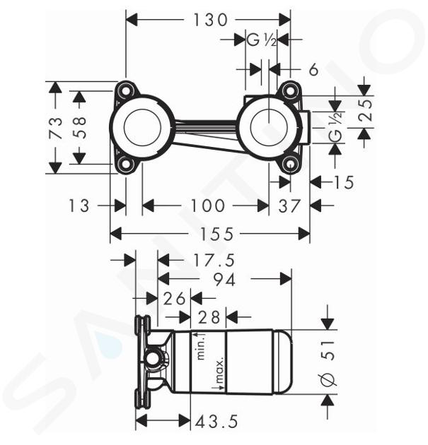 El cuerpo de montaje 13622180 de Hansgrohe está diseñado para un grifo empotrado de dos orificios. Está equipado con un bloque de lavado. La ventaja es el posicionamiento variable del cartucho cerámico, puedes colocarlo tanto a la derecha como a la izquierda del caño. Si lo deseas, puedes pedir una extensión. El grifo empotrado destaca por su precisión en el diseño y la calidad de los materiales.