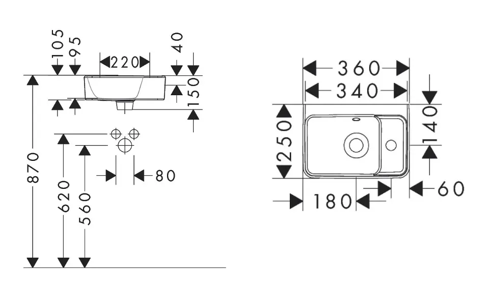 Lavamanos 360/250 con orificio para grifo, con rebosadero