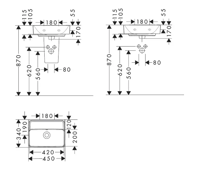 Lavamanos 450/340 sin orificio para grifo, con rebosadero