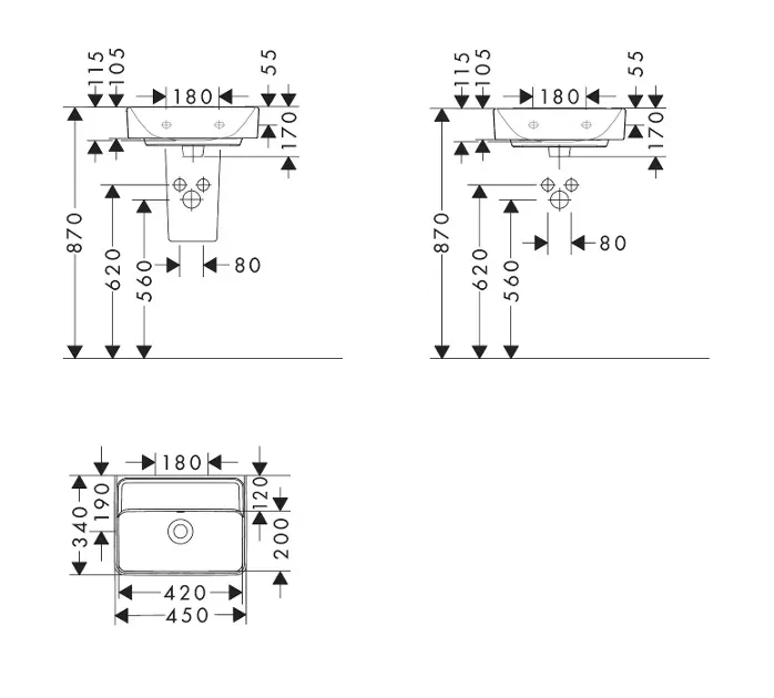 Lavamanos 450/340 sin orificio para grifo, con rebosadero, SmartClean