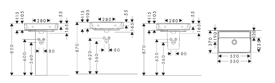 Lavabo Compact 550/370 sin orificio para grifo, con rebosadero