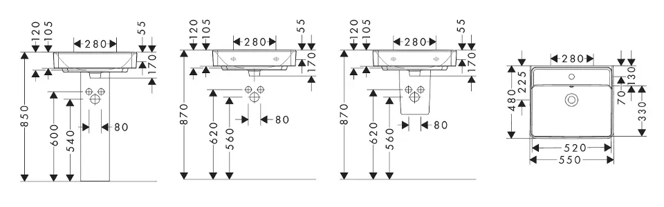 Lavabo 550/480 con orificio para grifo, con rebosadero