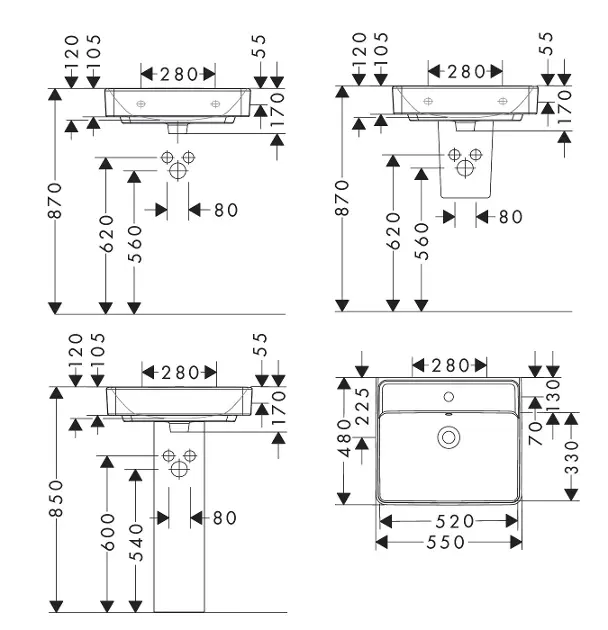 Lavabo 550/480 con orificio para grifo, con rebosadero, SmartClean
