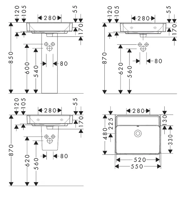 Lavabo 550/480 sin orificio para grifo, con rebosadero