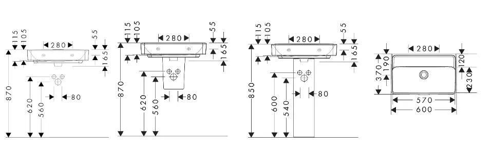 Lavabo Compact 600/370 sin orificio para grifo, sin desagüe