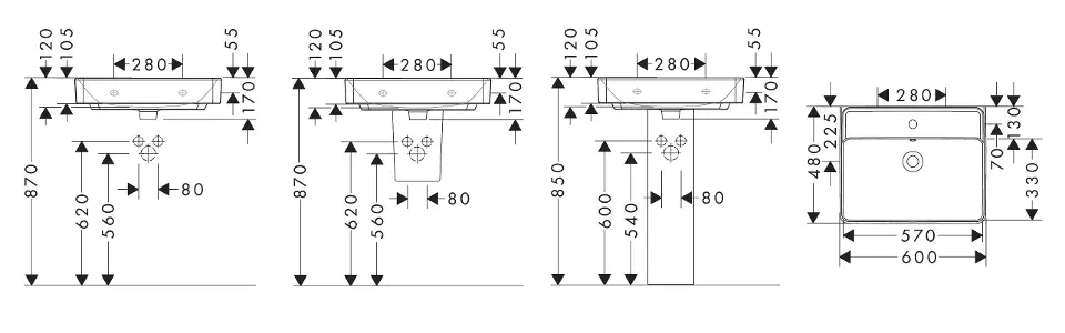 Lavabo 600/480 con orificio para grifo, con rebosadero