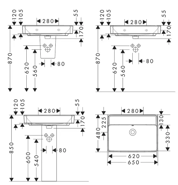 Lavabo 650/480 sin orificio para grifo, con rebosadero
