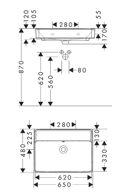 Lavabo sobre encimera 650/480 sin orificio para grifo, con rebosadero