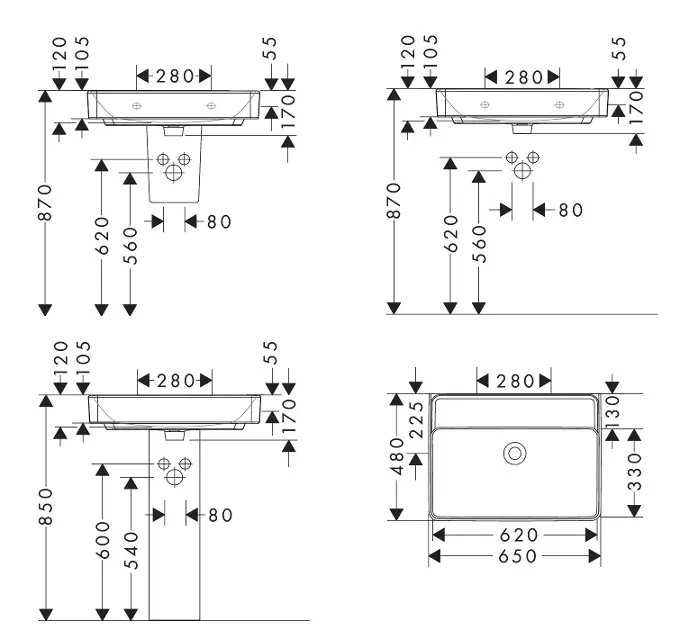 Lavabo 650/480 sin orificio para grifo, sin rebosadero, SmartClean