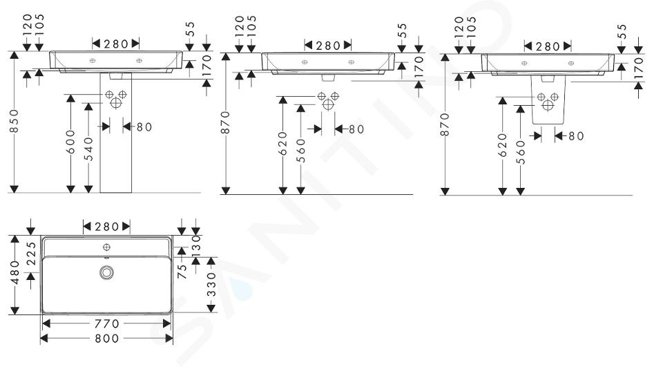 Lavabo 800/480 con orificio para grifo, con rebosadero