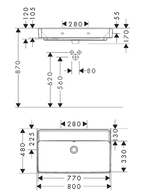Lavabo sobre encimera 800/480 sin orificio para grifo, con rebosadero