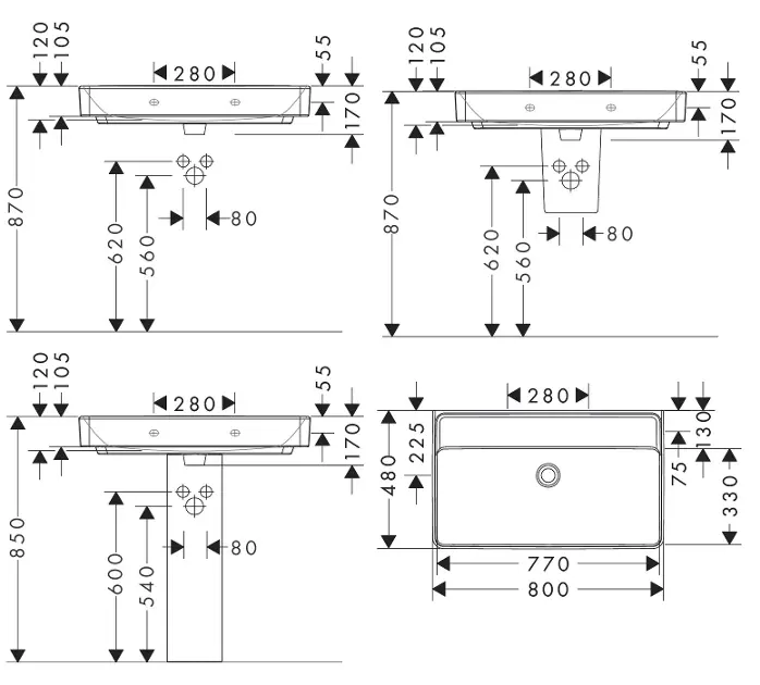 Lavabo 800/480 sin orificio para grifo, sin rebosadero, SmartClean