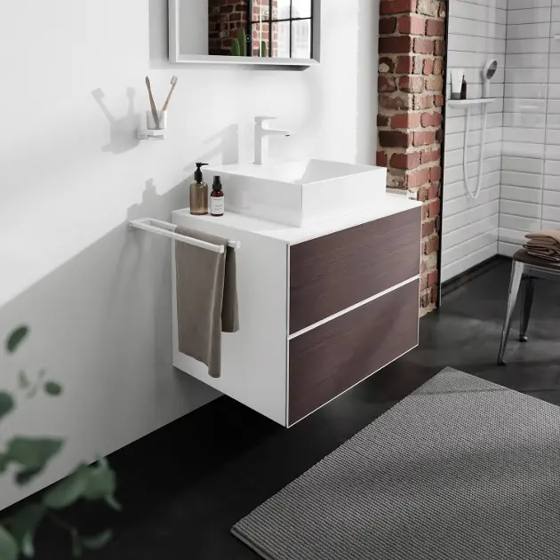 Hansgrohe Xevolos E es una serie premium de lavabos y muebles de baño que destaca por su diseño arquitectónico, funcionalidad y atención al detalle. Los lavabos están fabricados con cerámica sanitaria resistente y cuentan con el acabado SmartClean, que facilita la limpieza y garantiza una larga durabilidad. El mobiliario Xevolos E ofrece una amplia gama de armarios y soluciones de almacenamiento con un elegante diseño cúbico, disponible en diferentes combinaciones de colores y acabados.