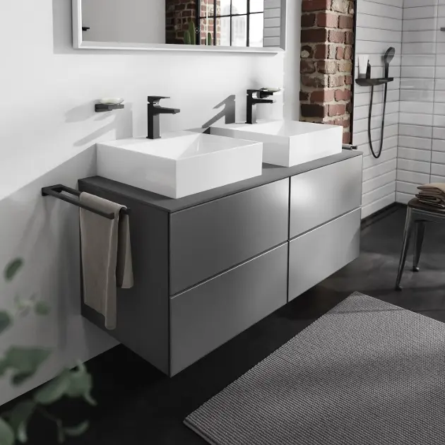Hansgrohe Xevolos E es una serie premium de lavabos y muebles de baño que destaca por su diseño arquitectónico, funcionalidad y atención al detalle. Los lavabos están fabricados con cerámica sanitaria resistente y cuentan con el acabado SmartClean, que facilita la limpieza y garantiza una larga durabilidad. El mobiliario Xevolos E ofrece una amplia gama de armarios y soluciones de almacenamiento con un elegante diseño cúbico, disponible en diferentes combinaciones de colores y acabados.