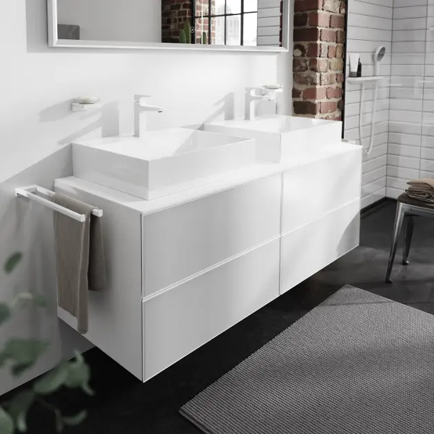 Hansgrohe Xevolos E es una serie premium de lavabos y muebles de baño que destaca por su diseño arquitectónico, funcionalidad y atención al detalle. Los lavabos están fabricados con cerámica sanitaria resistente y cuentan con el acabado SmartClean, que facilita la limpieza y garantiza una larga durabilidad. El mobiliario Xevolos E ofrece una amplia gama de armarios y soluciones de almacenamiento con un elegante diseño cúbico, disponible en diferentes combinaciones de colores y acabados.
