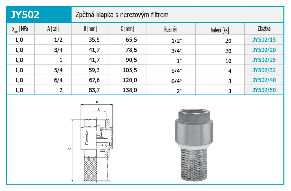 Válvula de retención con filtro de acero inoxidable. Diseñado sólo para agua fría