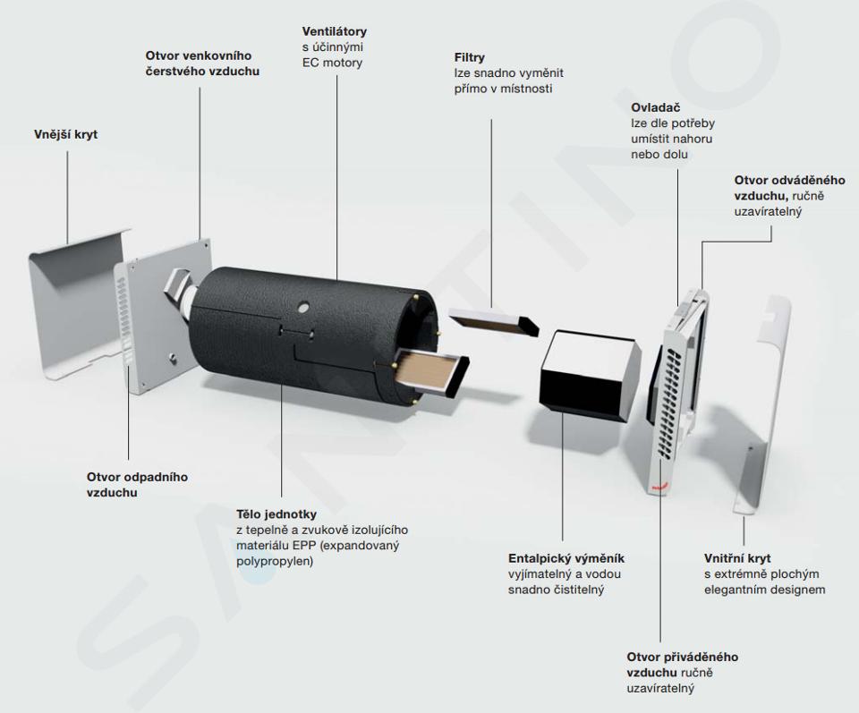 Para facilitar el manejo, el controlador está situado en la unidad. Una gran ventaja es el exclusivo intercambiador entálpico: no sólo extrae el calor del aire de salida, sino también la humedad, no se forma condensado y la fachada permanece limpia.